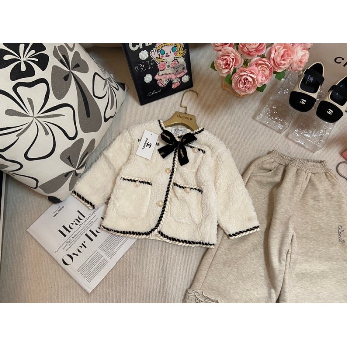 Chanel シャネルハイブランド子供ボアジャケット 裏起毛パンツ 女の子セットアップ ボアブルゾン キッズ 中綿フリースコート ワイドパンツ ガールズ モコモコ アウター 90-160cm ファージャケット 厚手 暖かい