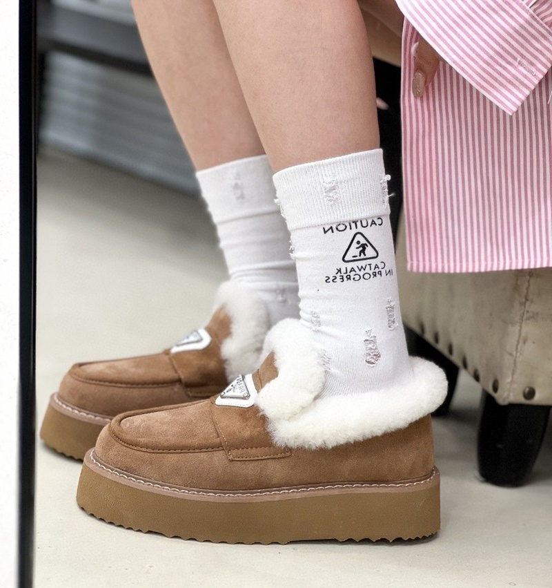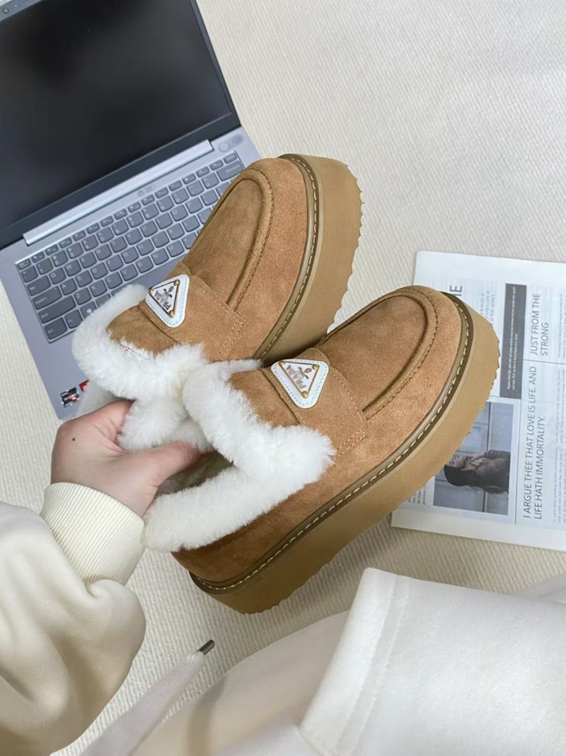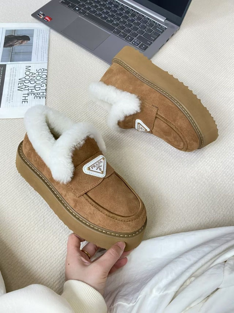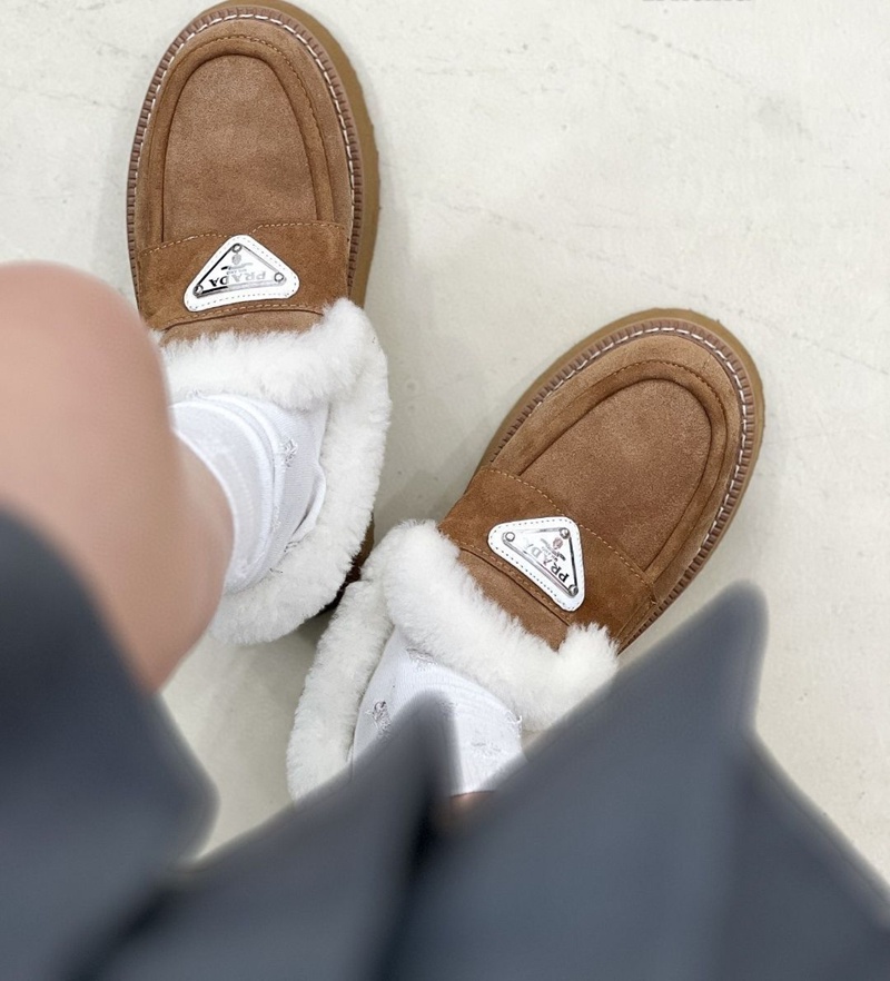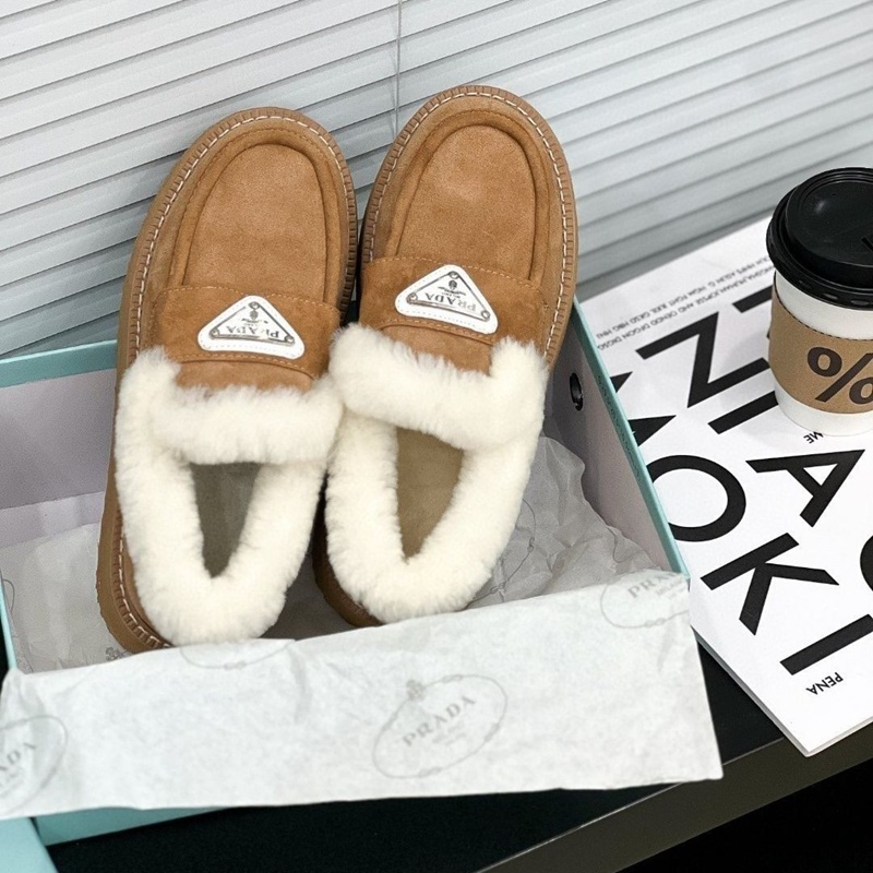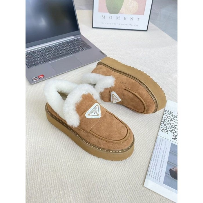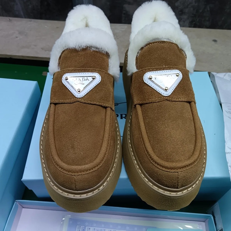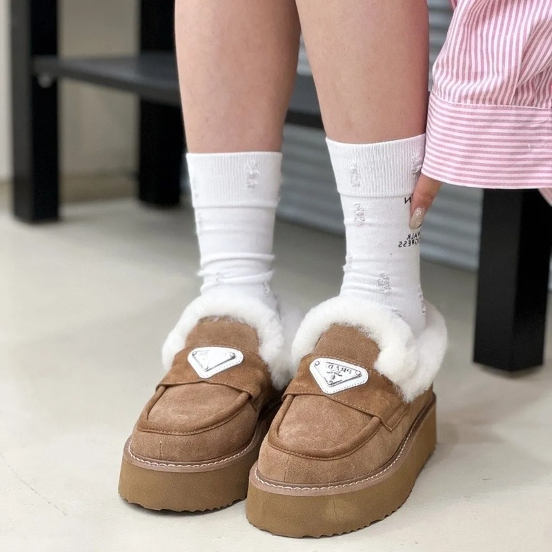 Prada プラダ ブランドレディースローファー 内ボア シューズ 厚底ミュール ファー付き 暖かい スリッポン 防寒 あったか ふわふわ 軽量 冬用シューズ カジュアル 225¬250cm