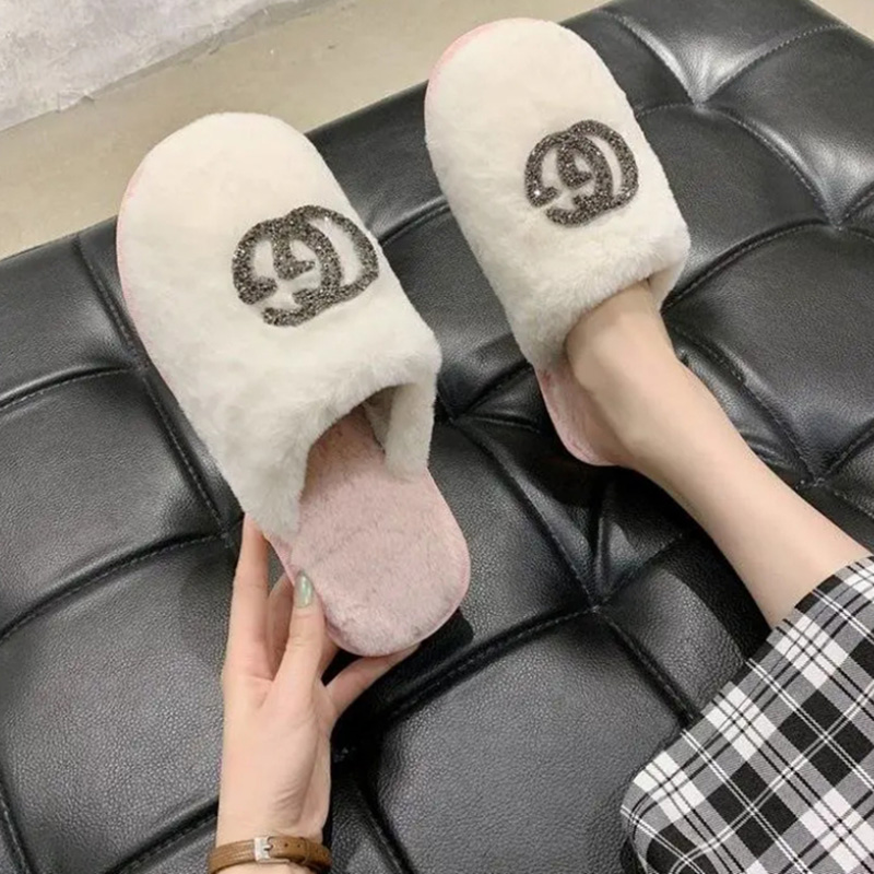 グッチもこもこ スリッパ ブランドおしゃれ 滑り止め 暖かい室内履きシューズGucci 秋冬 レディース かわいい厚底ふんわりスリッパ通販 キラキラ水ダイヤ付き靴