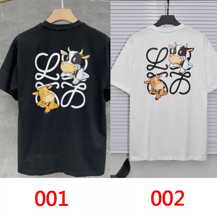 ロエベLoewe半袖Tシャツブランドファッション黒白コットンtシャツシンプルうし絵柄かわいいトップス若者愛用 ストリートtシャツ