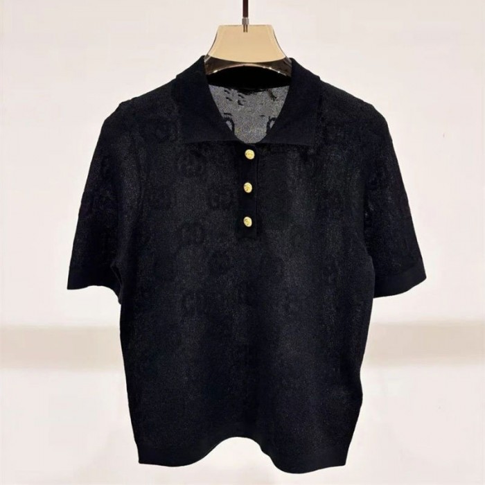 商品名:グッチポロシャツ レディース ニット Gucci 半袖 薄手 夏パフスリーブ Tシャツ GG柄 ショルダー 開襟 シャツ 伸縮 トップ スシンプル サマー 着やせ カジュアル キレイ 通勤オフィス 春夏秋