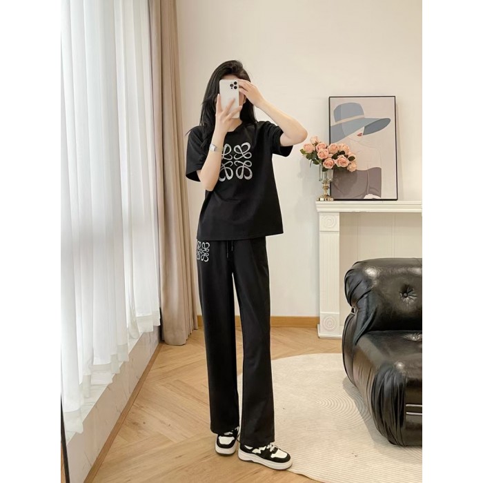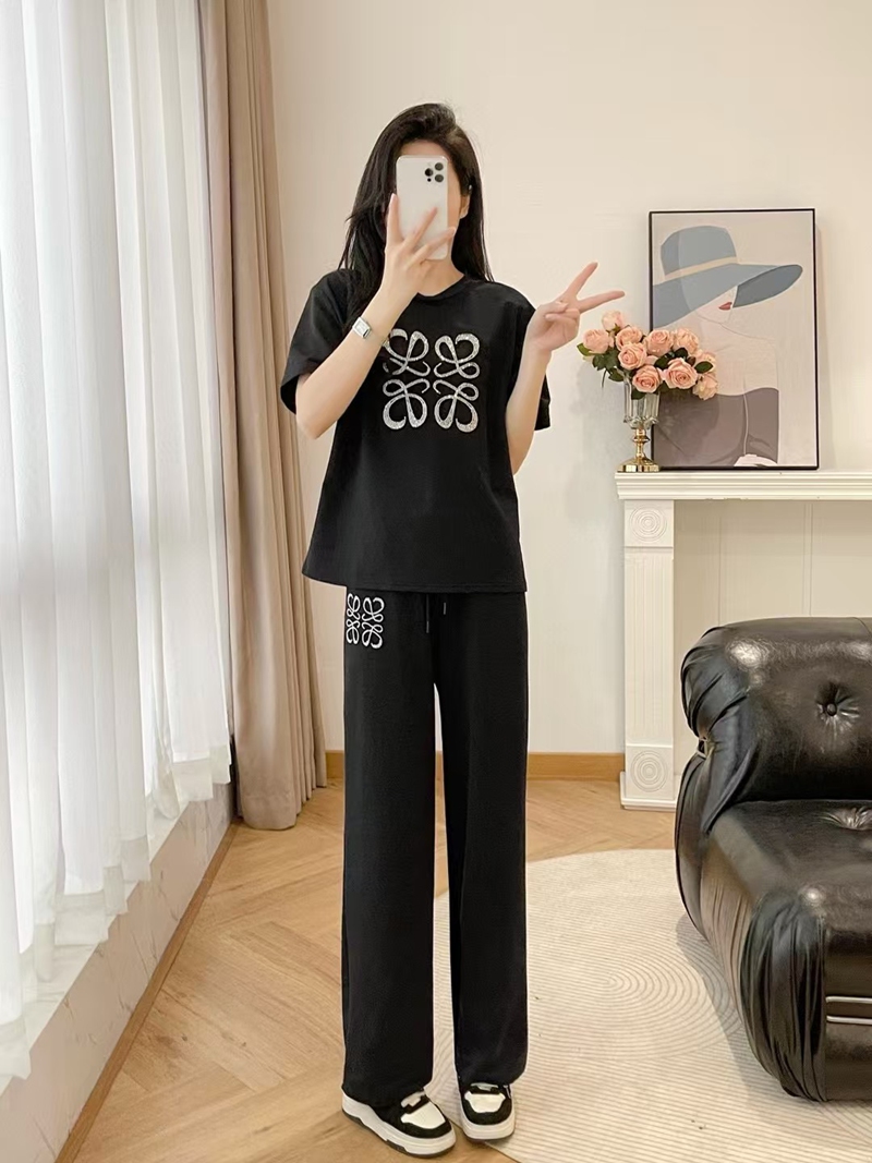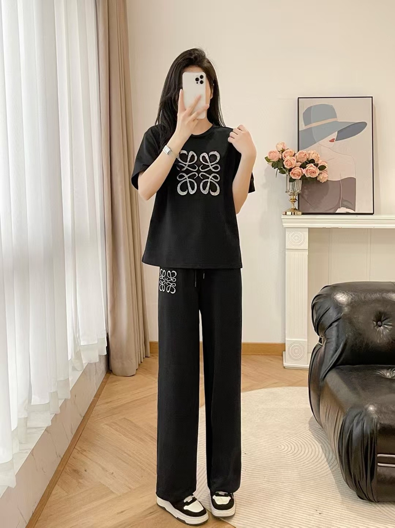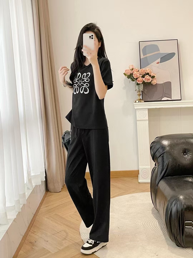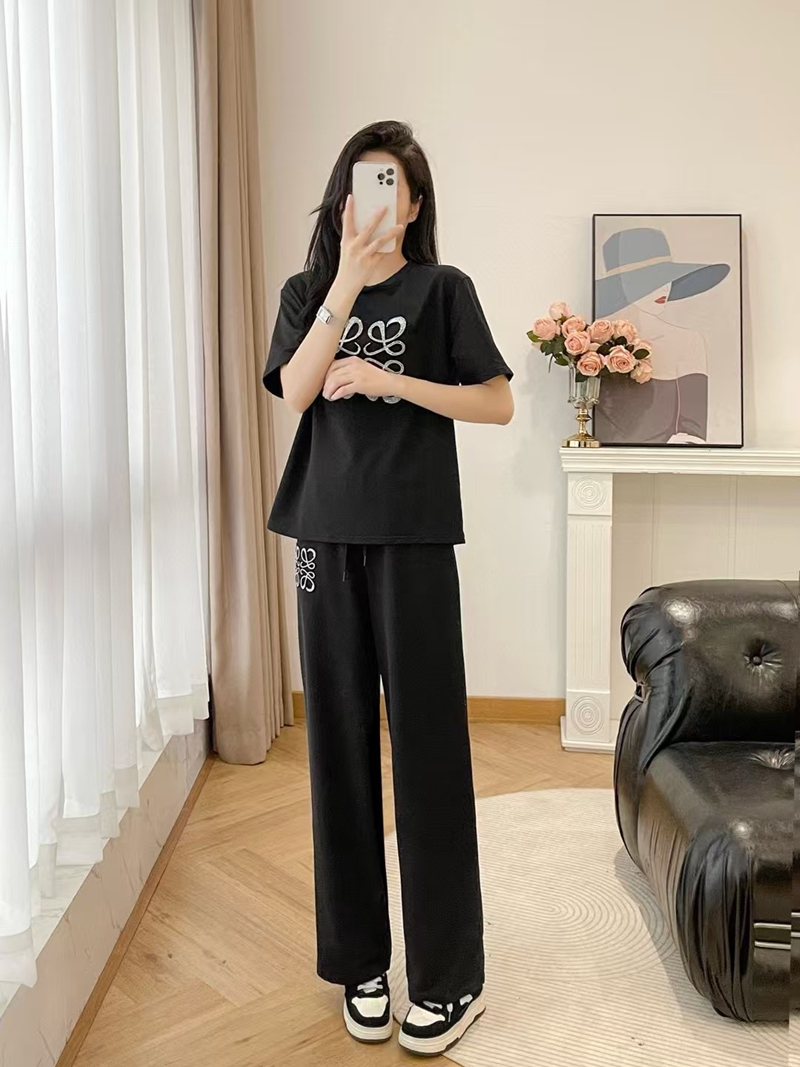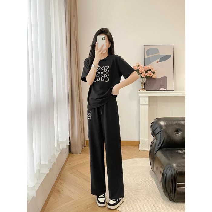 LOEWE ロエベブランド半袖tシャツ ロングパンツ 上下セット レディース 2点セット S M Lカジュアルズボン ワイドパンツ ズボン Tシャツ 丸首 半袖 柔らか 着痩せ お洒落 薄手 快適 カジュアル トップス 春夏 旅行 休暇 通勤